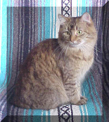 Several years later, after Katie and Nuage’s pasting, began keeping his distance from Anne’s Norwegian Forest Cat babies (Anne bred Norwegian Forest Cats too) and often became quite cranky. There finally came a day when Anne had to remove him from the common room, and provide him with his own living quarters.