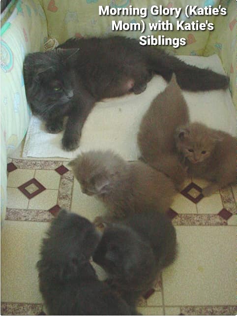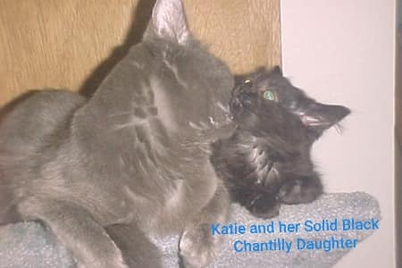 In December of 2001 a new Cattery became part of the Chantilly breeding program. The Cattery begin with Hersey Nugget from Emberhearth. It was called Amorino Cattery, the name meaning “Infant Cupids”. Cadeautju (Katie for short) was part of Amormino’s breeding program. Her name translated into little blue present. She was shy around strangers, but very close with her family. A solid Black Chantilly named Bella was her first kitten. She was a very good mother, and took care of her kittens. Squabbles never lasted long when she was around. Katie produced lots of babies in her lifetime, she later died due to a heart problem.